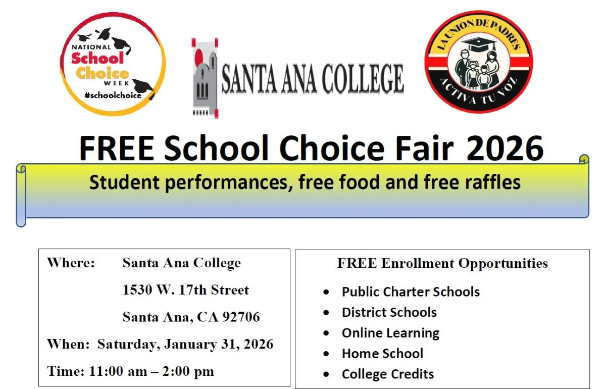 The annual Orange County School Choice Fair is coming up on January 31 at Santa Ana College, from 11 a.m. to 2 p.m.. This event is organized by La Union de Padres in collaboration with the National School Choice Awareness Foundation.