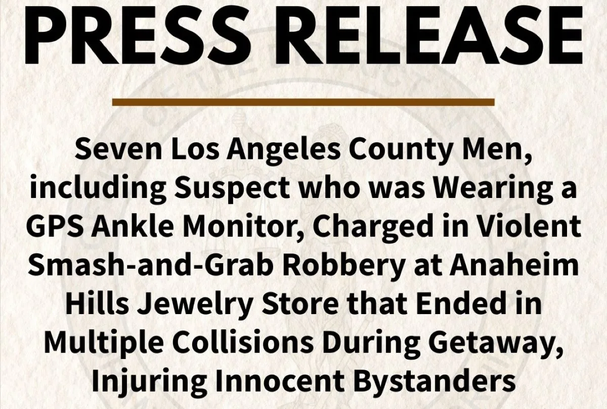 SANTA ANA, Calif. – Seven Los Angeles County men, including second-striker who was wearing a GPS ankle monitor, have been charged with multiple felonies in connection with a violent smash-and-grab robbery at an Anaheim Hills jewelry store Friday afternoon using a stolen car to ram the store’s entrance and hammers and crowbars to smash the store’s display cases and steal hundreds of thousands of dollars in jewelry. The seven men and one juvenile were arrested after the thieves escaped in two stolen Dodge Chargers and then crashed in two separate multi-vehicle collisions in Fullerton, injuring several innocent bystanders, before being arrested.