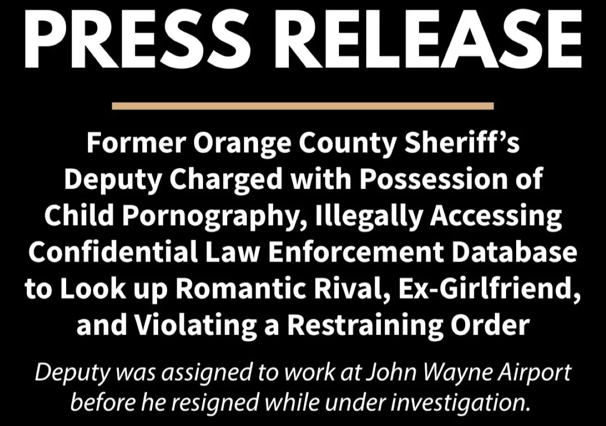 SANTA ANA, Calif. –  A former Orange County Sheriff’s deputy who was assigned to work at John Wayne Airport has been charged with possessing child pornography, illegally accessing a confidential law enforcement database to look up his ex-girlfriend and her new boyfriend, and violating a restraining order by showing up to his ex-girlfriend’s home in the middle of the night. The deputy resigned from the Orange County Sheriff’s Department while under investigation, and he is accused of committing the crimes while employed as a sworn law enforcement officer.