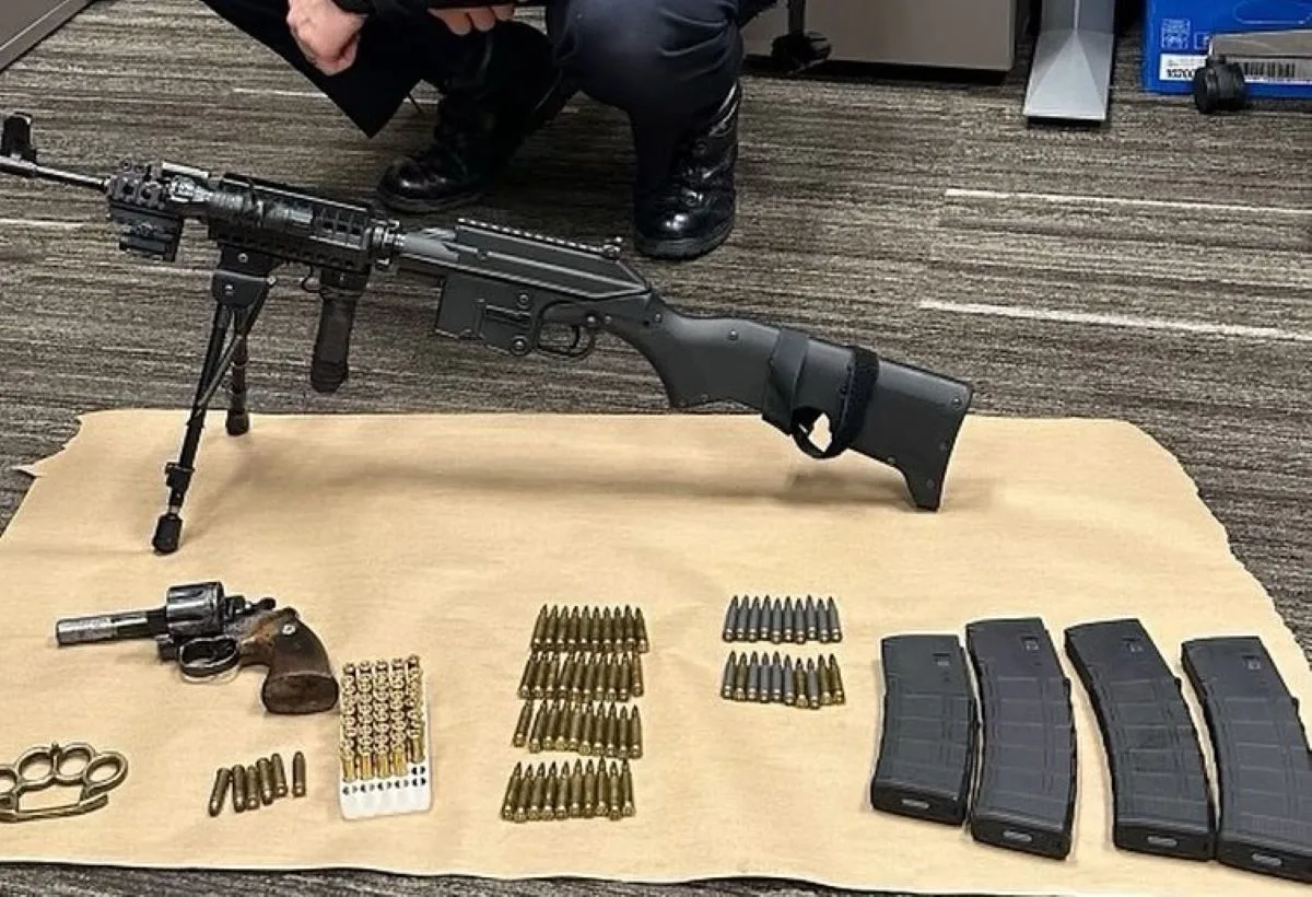 With assistance from another officer, a search of the vehicle uncovered a loaded .357 Magnum revolver, a KelTec AR-15 rifle, and multiple high-capacity magazines, all illegally possessed and not registered. In total, officers recovered: