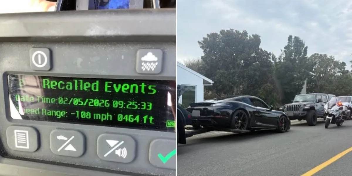 The impounded vehicle was a Porsche 718 Cayman, likely a GTS or GT4 variant, being loaded onto a flatbed after the driver was arrested for speeding at 108 mph.