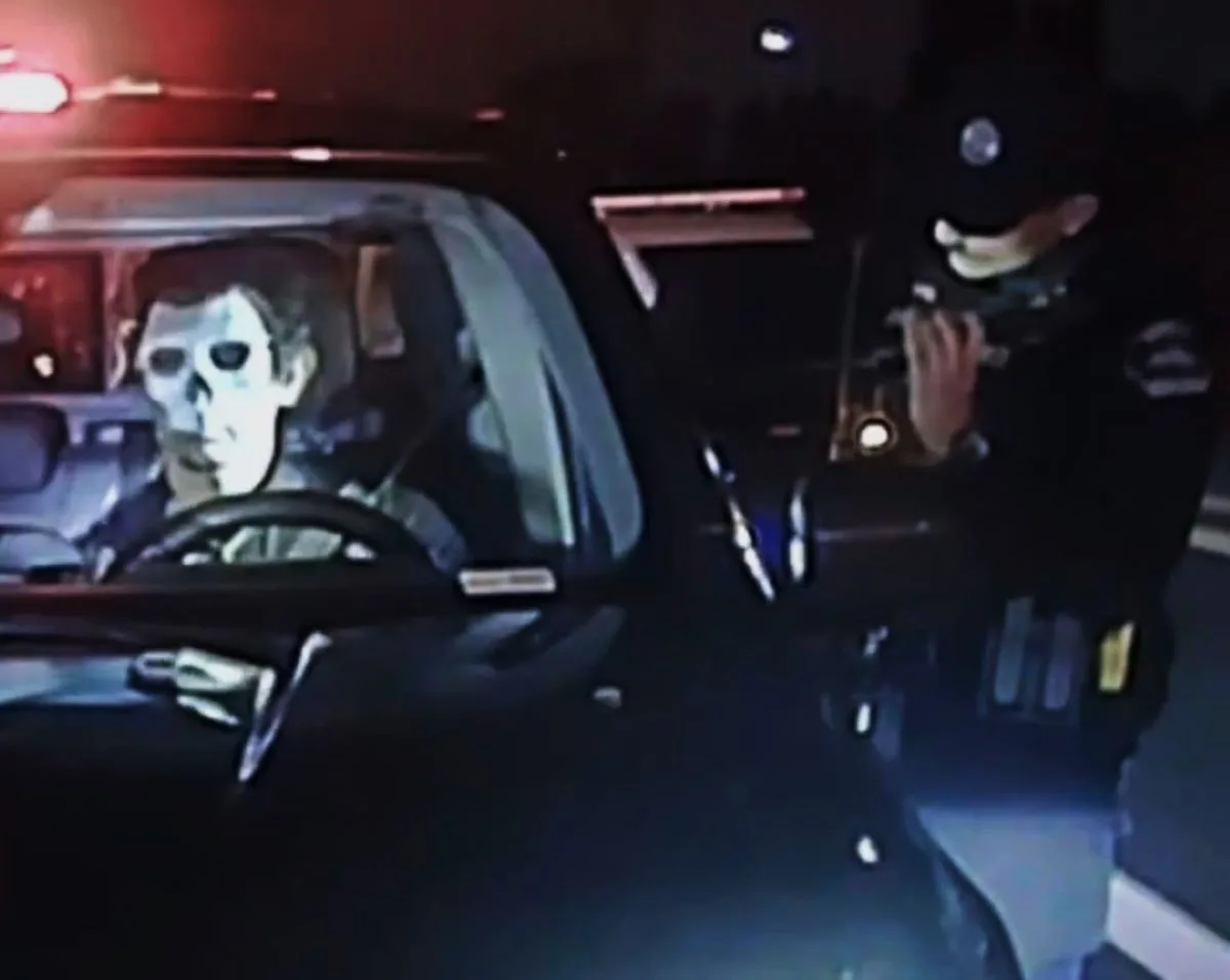 The motorist was wearing a skull mask and appeared to be under the influence while the vehicle was in the middle of the road.
