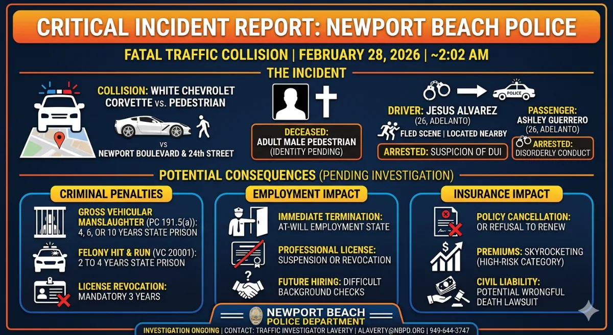 On February 28, 2026, at approximately 2:02 a.m., the Newport Beach Police Department Dispatch Center received a call regarding a traffic collision involving a white Chevrolet Corvette and a pedestrian in the area of Newport Boulevard and 24th Street.