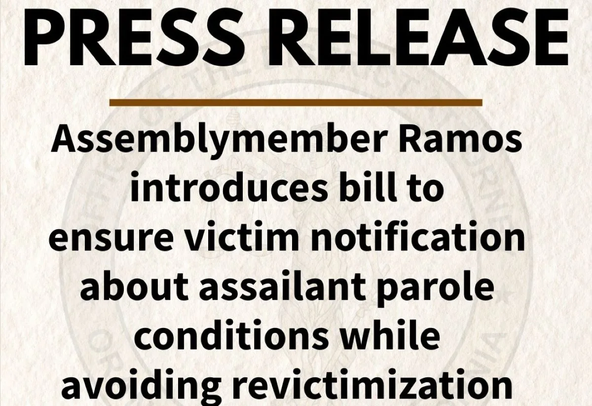 SACRAMENTO—Protecting crime victims’ rights by ensuring they receive timely notifications about an offender’s release, parole hearings, escapes, or special parole conditions is the goal of legislation introduced by Assemblymember James C. Ramos (D–San Bernardino).