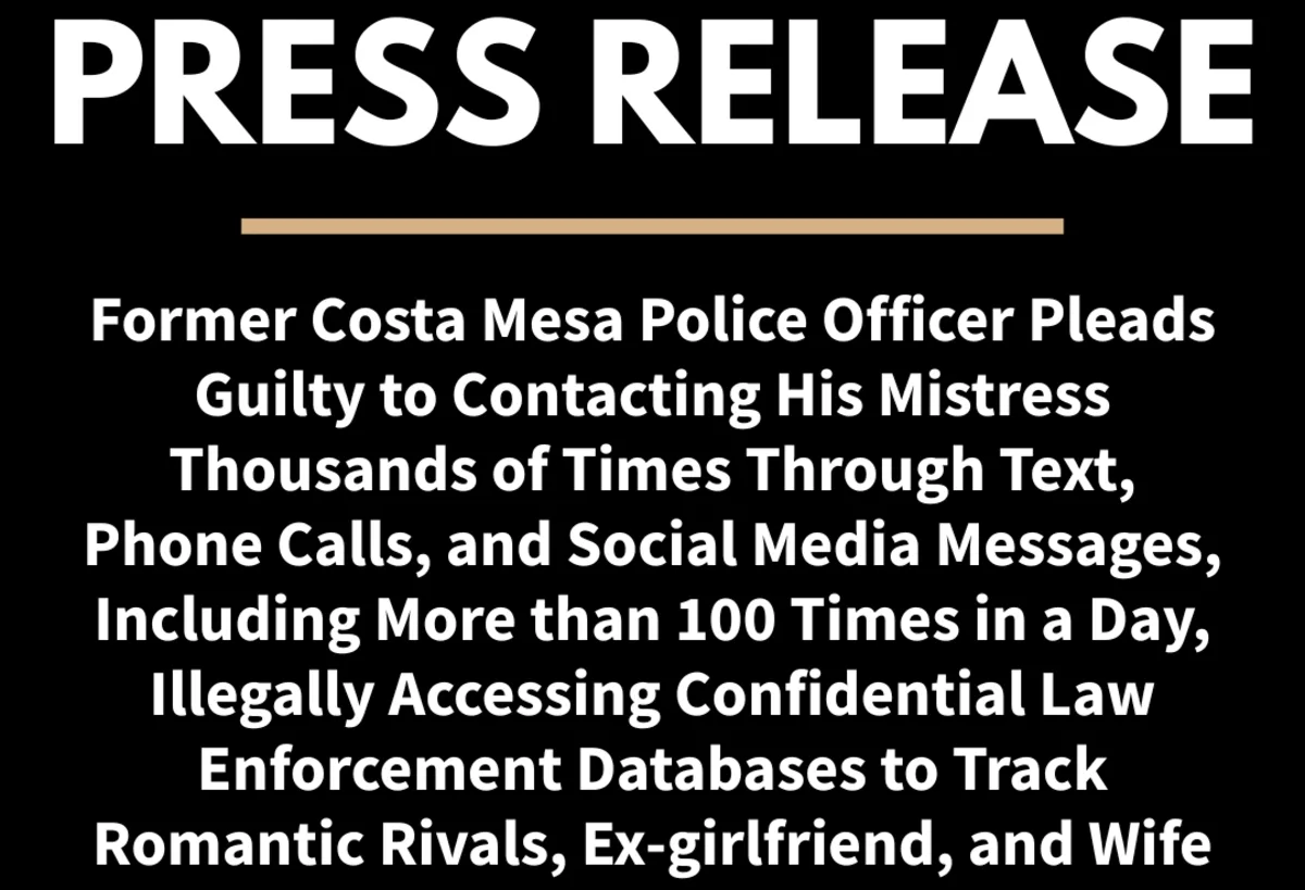 SANTA ANA, Calif. – A former Costa Mesa police officer pleaded guilty to contacting his mistress thousands of times through text, telephone calls, and social media messages, sometimes more than 100 times in a day, over nine months and used confidential law enforcement databases to track her whereabouts, the whereabouts of her romantic partners and the whereabouts of his own wife.