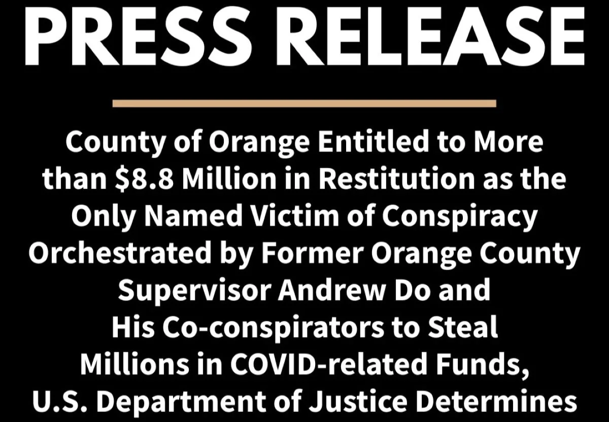 SANTA ANA, Calif. – The United States Department of Justice has determined the County of Orange is the only victim in the conspiracy orchestrated by former Orange County Supervisor Andrew Do to steal millions in COVID-related funds in exchange for $550,000 in bribes, and the County is entitled to more than $8.8 million in total restitution as a result of the actions of the disgraced county supervisor and his co-conspirators.