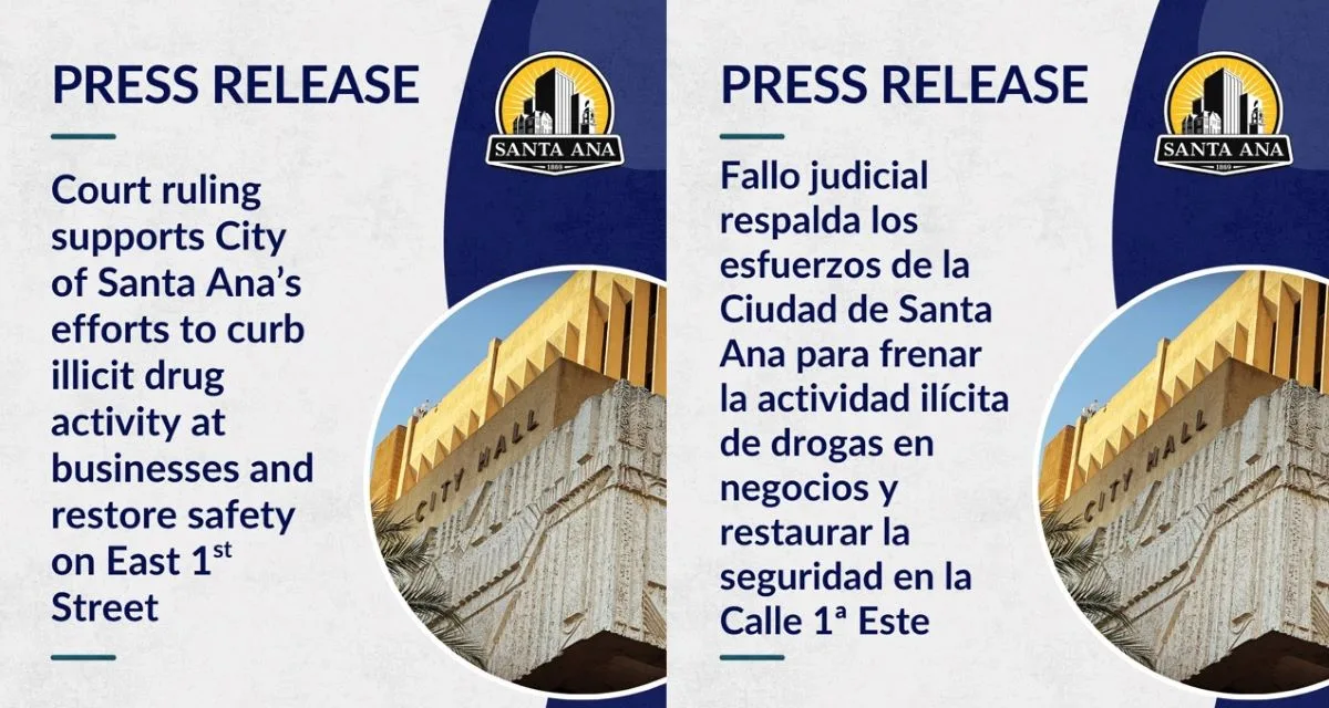 “This ruling represents a major step forward in our ongoing efforts to protect our neighborhoods and restore safety and dignity to East 1st Street,” Mayor Valerie Amezcua said. “We are sending a clear message that drug-related activity will not be tolerated in our city. I want to thank our City Attorney’s Office, Santa Ana Police Department, Code Enforcement officers and all the residents who continue to stand with us in building a safer community.”