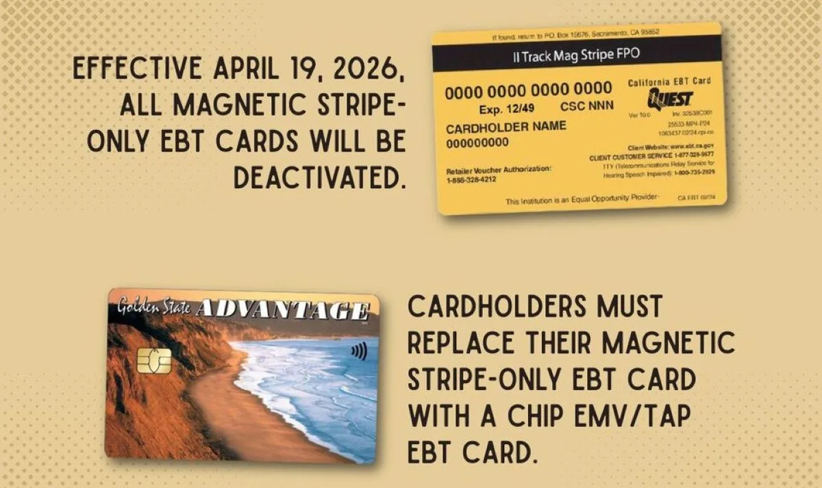 Orange County, Calif. (April 13, 2026) — Magnetic stripe-only Electronic Benefit Transfer (EBT) cards previously issued to residents will be deactivated on Sunday, April 19, 2026.