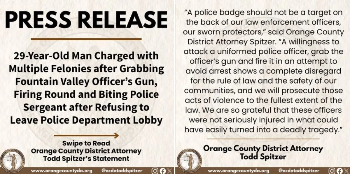 “A police badge should not be a target on the back of our law enforcement officers, our sworn protectors,” said Orange County District Attorney Spitzer. “A willingness to attack a uniformed police officer, grab the officer’s gun and fire it in an attempt to avoid arrest shows a complete disregard for the rule of law and the safety of our communities, and we will prosecute those acts of violence to the fullest extent of the law. We are so grateful that these officers were not seriously injured in what could have easily turned into a deadly tragedy.”