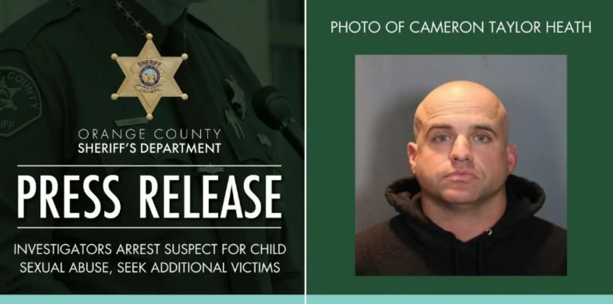 (Dec. 11, 2025) On Thursday, Dec. 4, 2025, Orange County Sheriff’s Department Special Victims Detail (SVD) investigators arrested Cameron Taylor Heath, 39, following an investigation into allegations of child s*xual abuse involving a male victim who was 12 to 13 years old at the time of the reported incidents.