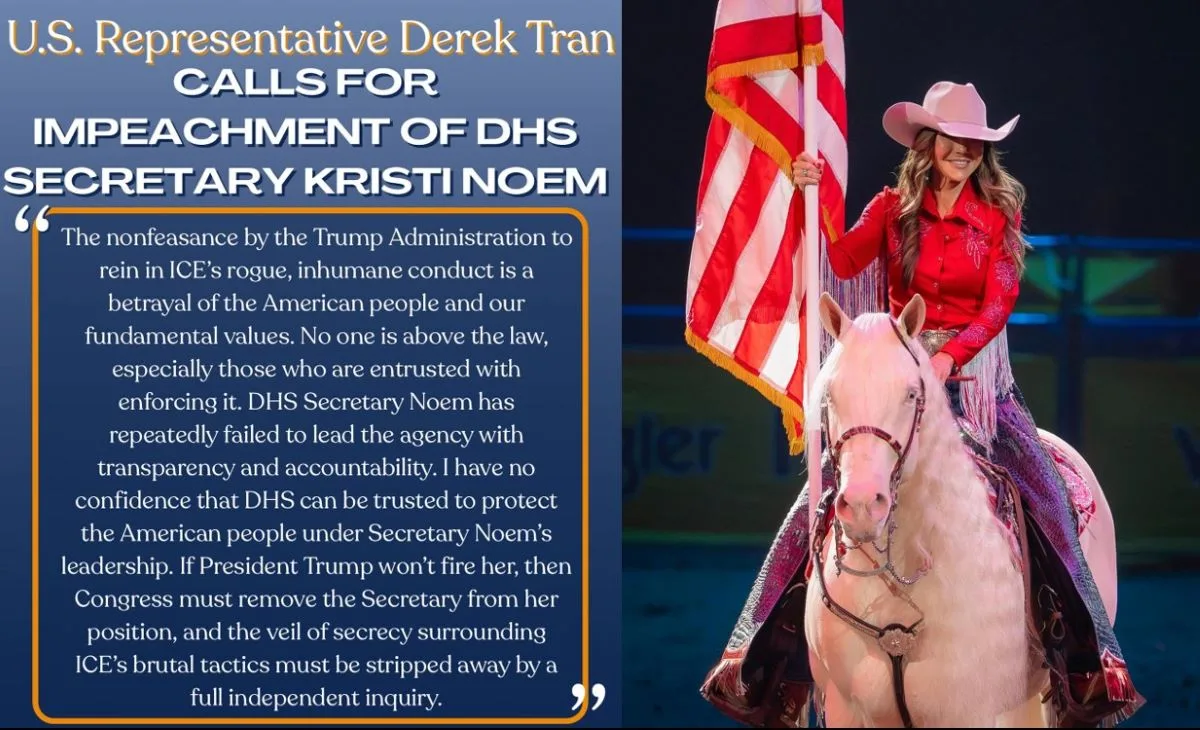 Washington, DC – Today, U.S. Representative Derek Tran (CA-45) announced his co-sponsorship of H. Res.996, a Congressional resolution to impeach Department of Homeland Security (DHS) Secretary Kristi Noem for high crimes and misdemeanors in response to the pattern of escalating force and lethal violence exhibited by Immigration and Customs Enforcement (ICE) officers under her leadership.