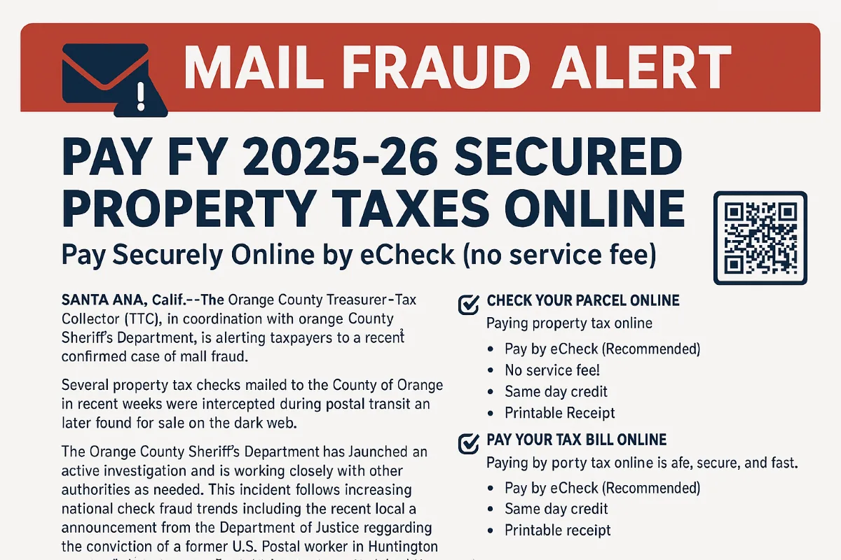 SANTA ANA, Calif. – The Orange County Treasurer-Tax Collector (TTC), in coordination with the Orange County Sheriff’s Department, is alerting taxpayers to a recent confirmed case of mail fraud involving multiple property tax payments.