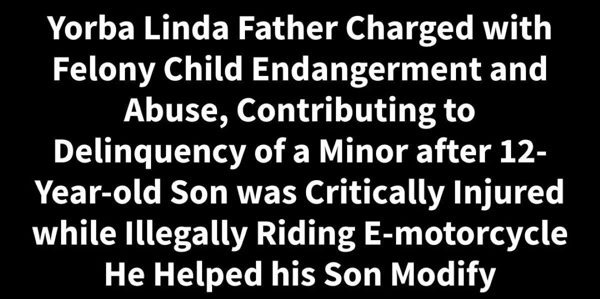 SANTA ANA, Calif. – A Yorba Linda father has been charged with felony child endangerment and abuse and misdemeanor contributing to the delinquency of a minor after his 12-year-old son was critically injured after he ran a red light and was hit by a car while illegally riding an E-motorcycle which he and his father had unlawfully modified.