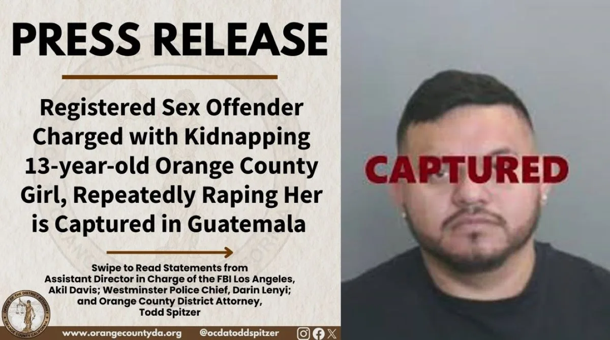 SANTA ANA, Calif. – A registered sex offender charged with kidnapping a 13-year-old Orange County girl and repeatedly raping her over several hours has been captured in Guatemala as part of a multi-jurisdictional effort to bring the wanted fugitive to justice.