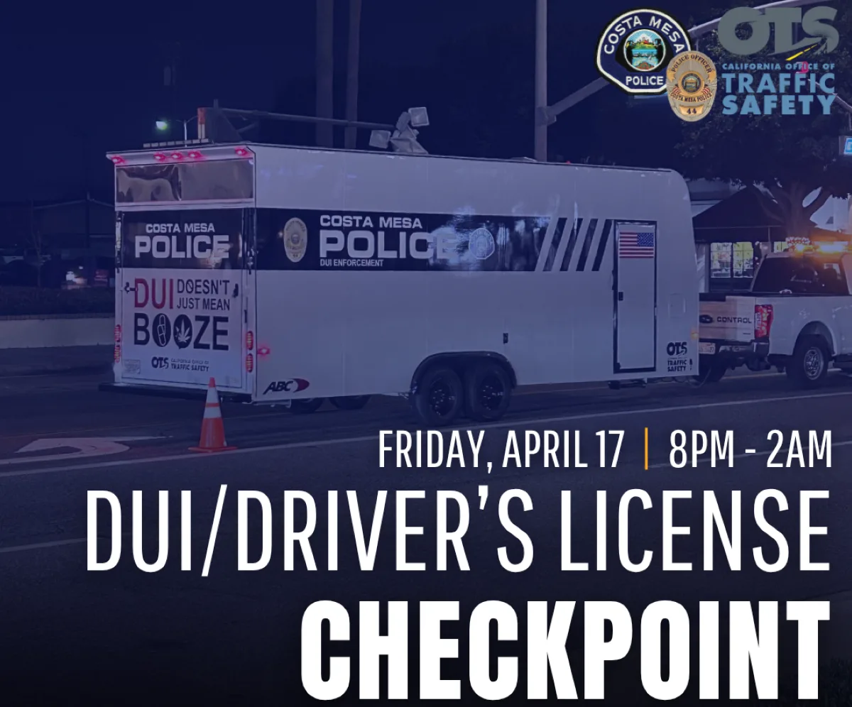 COSTA MESA, Calif. (April 15, 2026) – The Costa Mesa Police Department (CMPD) will be conducting a driving under the influence (DUI) and driver’s license checkpoint on Friday, April 17, 2026, from 8:00 p.m. to 2:00 a.m. within the city limits.