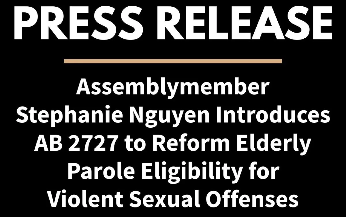 Sacramento, CA — Assemblymember Stephanie Nguyen has introduced AB 2727, co-sponsored by the Sacramento County District Attorney’s Office and the Orange County District Attorney’s Office, to reform California’s elderly parole program following recent cases that have raised concerns about how the law applies to individuals convicted of violent sexual offenses against children.