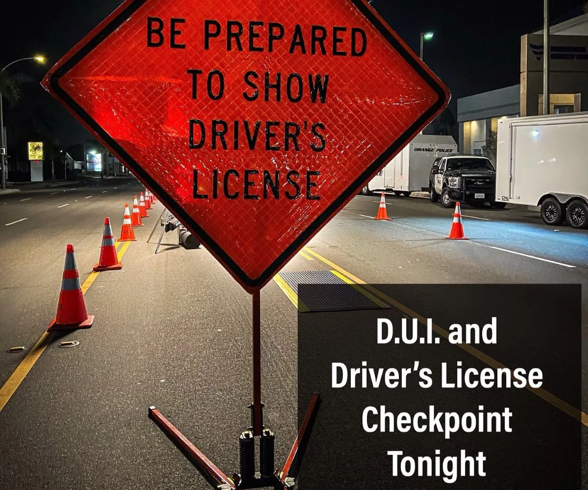 The Orange Police Department will be conducting a DUI/Driver’s License Checkpoint tonight, at 1800 W. Chapman Avenue, between the hours of 7:00 p.m. to 2:00 a.m.