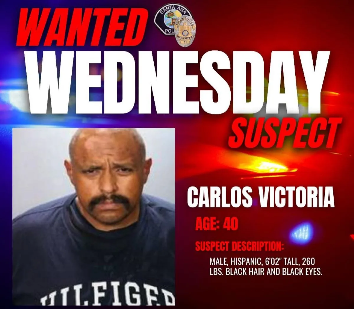 Police etectives are asking for your help locating Carlos Victoria (40) of Santa Ana, wanted for stealing a victim’s vehicle and later checking into the Civic Center Inn at 2720 N. Grand Ave., according to the Santa Ana Police Department (SAPD).